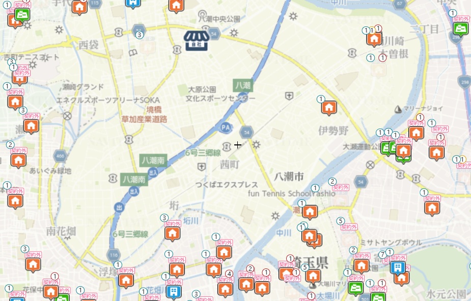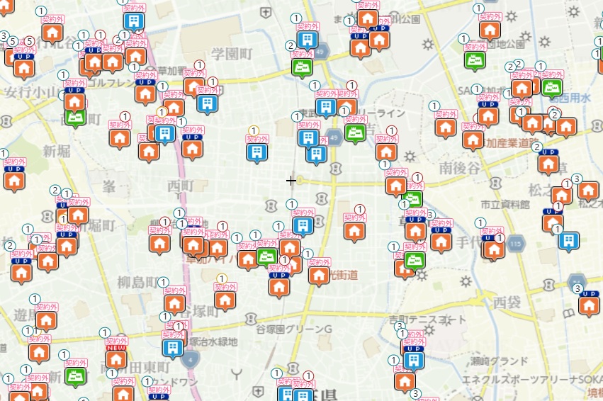 下の画像は、当社が加盟している不動産業者専用サイトの物件マップです。